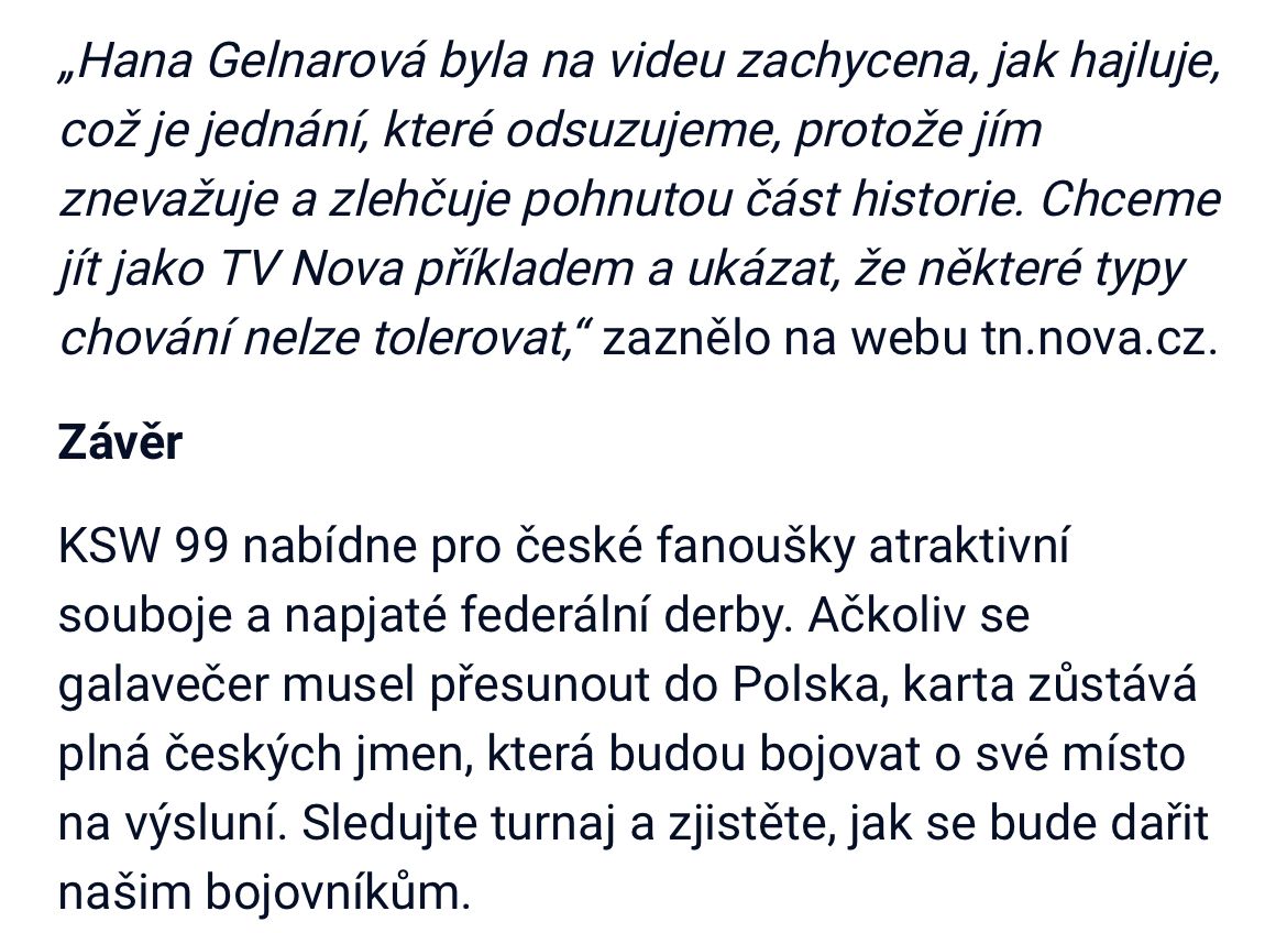 Hana Gelnarová se však rozhodla tuto hrůznou symboliku přenést zpět do dnešní doby, a to veřejně, před zraky tisíců fanoušků. Tento její čin nejenže znevažuje utrpení milionů obětí nacismu, ale také podkopává hodnoty, které by sportovci, zejména ti na veřejné scéně, měli zastávat – hodnoty jako rovnost, respekt a čest. Hajlování, které Gelnarová provedla, je symbolem nenávisti, brutality a genocidy – a zcela nepochopitelně zůstalo bez následků.