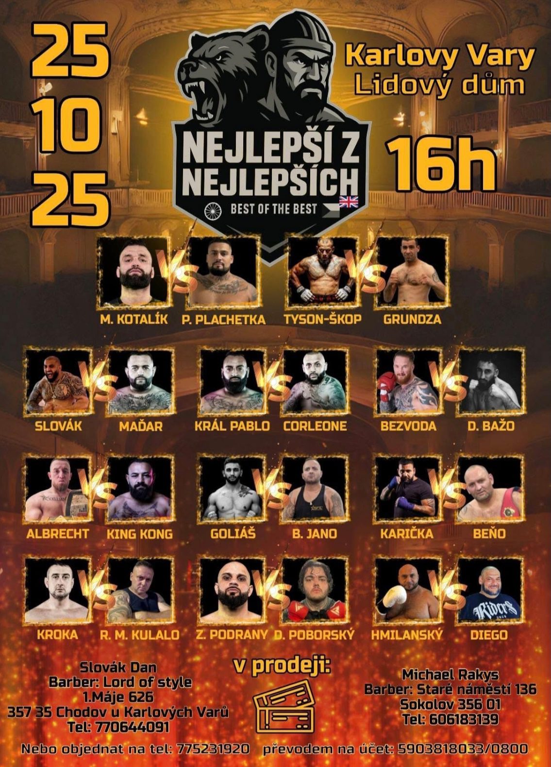 Karlovy Vary se chystají na premiéru unikátního galavečera bojových sportů – „Nejlepší z nejlepších“. Akce, která se uskuteční v sobotu 25. října 2025 v Lidovém domě, slibuje nejen napínavé zápasy, ale i hudební vystoupení a jedinečnou atmosféru.
